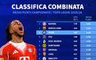 本赛季至今欧洲五大联赛场均积分TOP20: